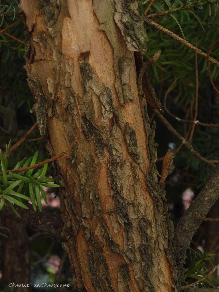 | Cis pospolity (Taxus baccata L.) - kora wiśniowo-szara lub ciemnobrunatna, później rdzawoszara, łuszcząca się cienkimi płatami. |